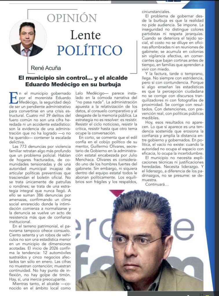 Mientras tanto, el alcalde —conocido en el ámbito local como Lalo Medécigo— parece instalado en la cómoda narrativa del “no pasa nada”. La administración apuesta a la relativización de los datos, al consuelo comparativo y al desgaste de la memoria pública. La estrategia no es resolver: es resistir. Resistir el ciclo noticioso, resistir la crítica, resistir hasta que otro tema ocupe la conversación.