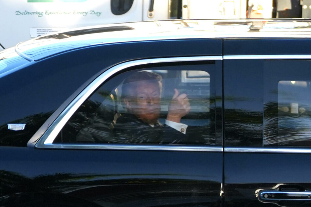 El presidente de Estados Unidos, Donald Trump., saluda durante su llegada al restaurante venezolano El Arepazo este lunes, en Doral, aproximadamente a 14-15 millas de Miami (Estados Unidos). EFE/Alberto Boal