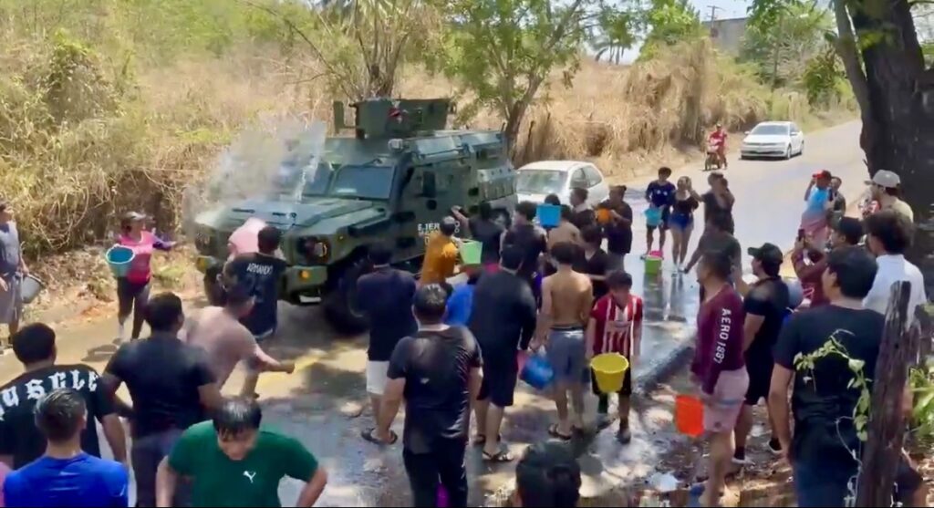 Arcelia.— Entre risas, cubetas y celulares grabando, habitantes sorprendieron a elementos del Ejército Mexicano al lanzarles agua mientras realizaban patrullajes en plena “Tierra Caliente” como se le conoce este municipio guerrerense.