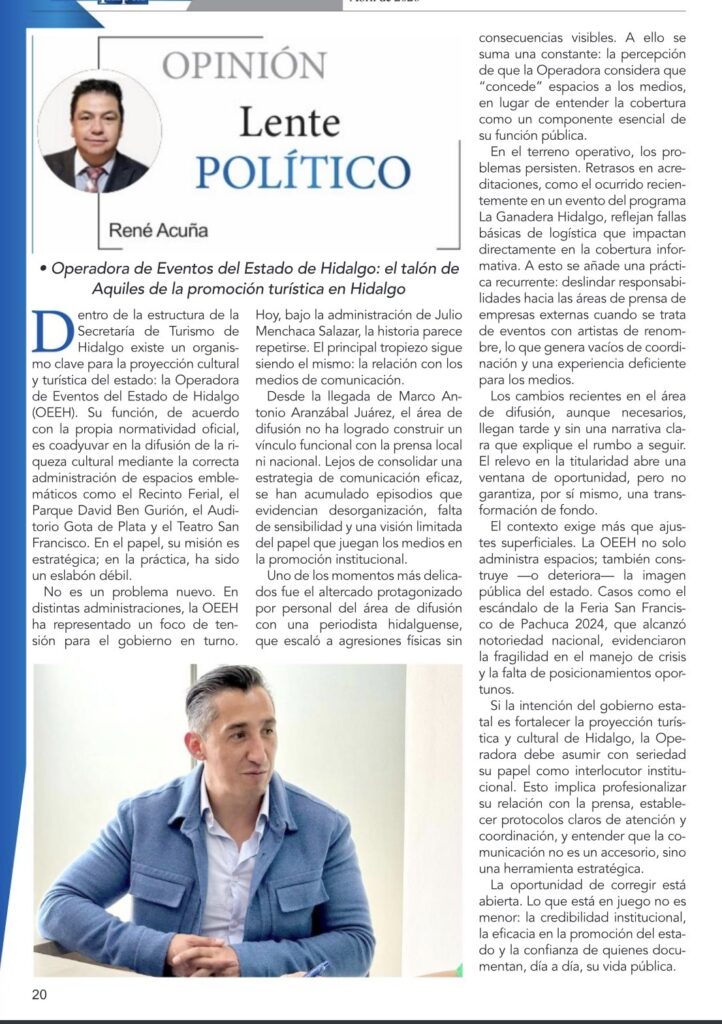 La Operadora de Eventos del Estado de Hidalgo (OEEH), encabezada por Marco Antonio Aranzábal Juárez, enfrenta una creciente serie de señalamientos por su manejo de la comunicación institucional, la relación con medios de comunicación y la operación de eventos públicos, situación que ya genera afectaciones en la percepción del gobierno de Julio Menchaca Salazar.